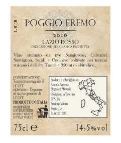 ポッジョ・エレモとは、「庵のある丘」という意味であり、古代エトルリアから続く歴史ある土地にかつては隠者の住む庵があったとされ今もその精神を受け継いだ者が天と地の秘密を知るためにワインを作つづけているようなイメージにした。